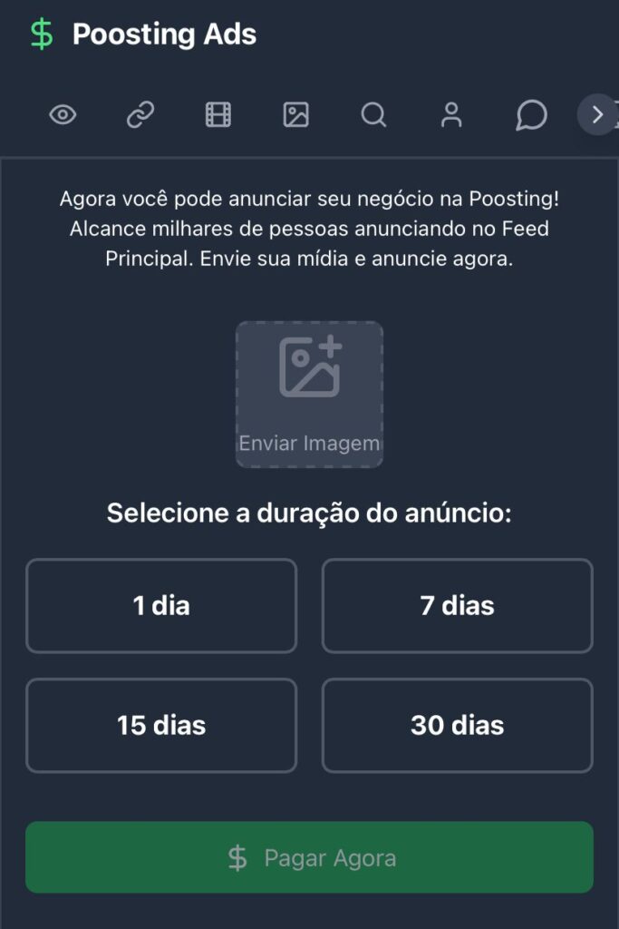 Com a chegada da nova funcionalidade, agora é possível criar campanhas de tráfego orgânico pago, uma inovação que a plataforma batizou de TOP ADS (Tráfego Orgânico Pago). A grande novidade está no modelo exclusivo da Poosting: os anúncios patrocinados são exibidos repetidamente durante 24 horas no feed cronológico dos usuários, garantindo visibilidade real e recorrente.