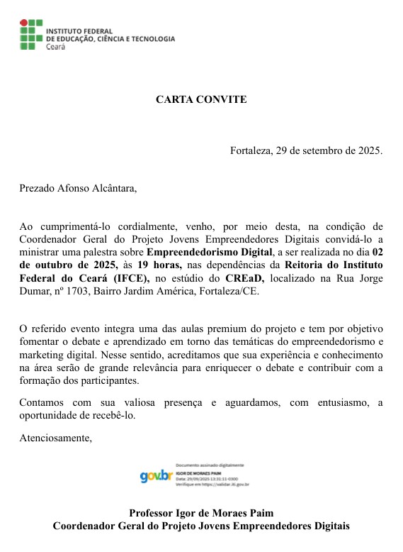 Para a Poosting, este convite é um marco que evidencia nosso compromisso em fortalecer a cultura empreendedora no Brasil. Estar lado a lado com uma instituição de referência como o IFCE é motivo de orgulho e motivação para continuarmos a impulsionar ideias e projetos que fazem a diferença.