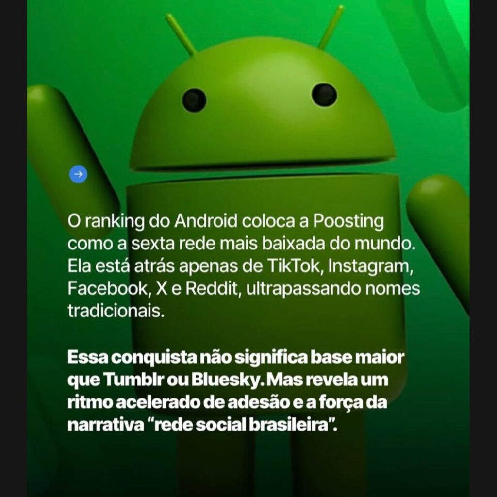 Segundo o ranking oficial do Android, a Poosting já é a sexta rede social mais baixada do mundo, atrás apenas de gigantes como TikTok, Instagram, Facebook, X (antigo Twitter) e Reddit. O feito evidencia a força da narrativa de uma “rede social brasileira”, capaz de rivalizar com plataformas globais tradicionais.
