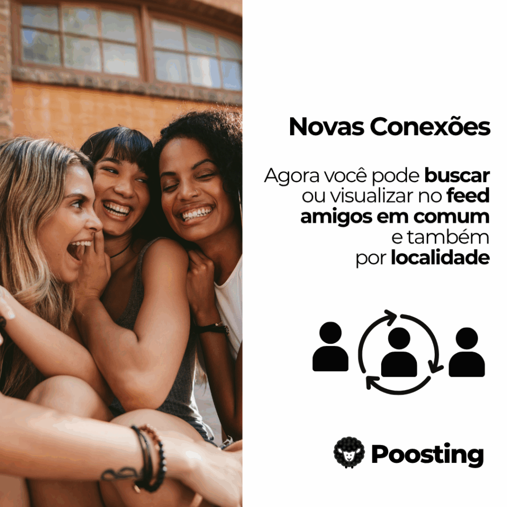 Você já quis conhecer pessoas novas que têm algo em comum com você como amigos, interesses ou até o mesmo cidade? Agora isso é possível com a nova funcionalidade da Poosting, que torna sua experiência na rede social ainda mais próxima e personalizada!
