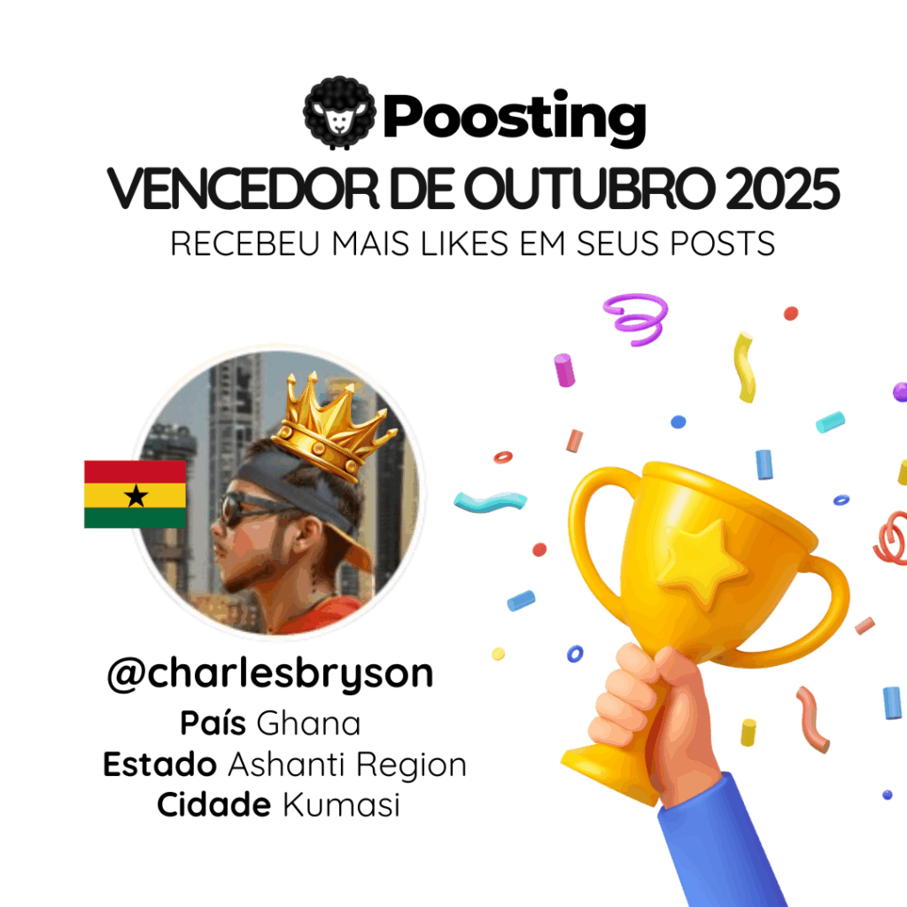 O mês de outubro foi marcado por muita criatividade, engajamento e postagens incríveis — e quem levou o troféu como Vencedor de Outubro 2025 na Poosting foi @charlesbryson, diretamente de Kumasi, na Ashanti Region, Gana 🇬🇭!