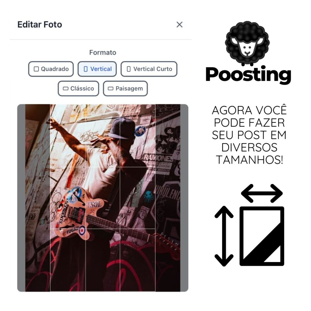 Ao editar uma imagem na Poosting, você pode escolher o formato ideal para o seu post com apenas um clique. O editor oferece opções como: