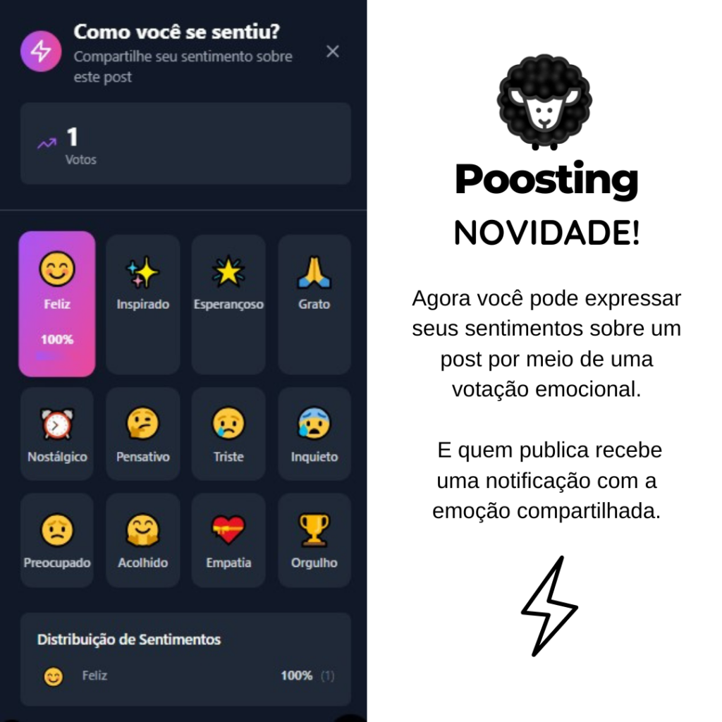 A Poosting acaba de lançar uma funcionalidade que transforma a forma como os usuários interagem com conteúdos na plataforma: agora é possível expressar sentimentos em relação a um post por meio de uma votação emocional. A novidade vai além do tradicional “curtir” e cria uma experiência mais humana, transparente e engajadora.